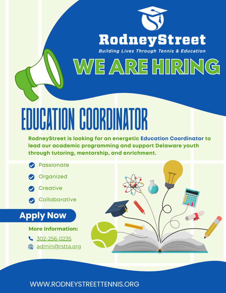 RodneyStreet is looking for individuals to provide tennis instruction, leadership, and a positive experience for our players. Our program components have various time commitments. Read our job description below. If you are interested, please email resume and statement of interest to admin@rstta.org